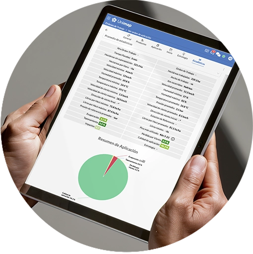 Genera informes detallados sobre aplicaciones y rendimiento. Facilita el análisis de datos históricos, mejorando la planificación y optimización de futuras pulverizaciones.