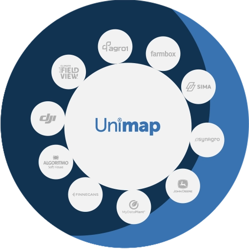 Unimap se conecta con las principales herramientas de gestión del agro: John Deere, MyDataplant, Finnegans, Albor, SIMA y Synagro. Sincronizá datos operativos, evitá cargas duplicadas y mejorá la eficiencia de tus aplicaciones con una gestión integrada y centralizada.